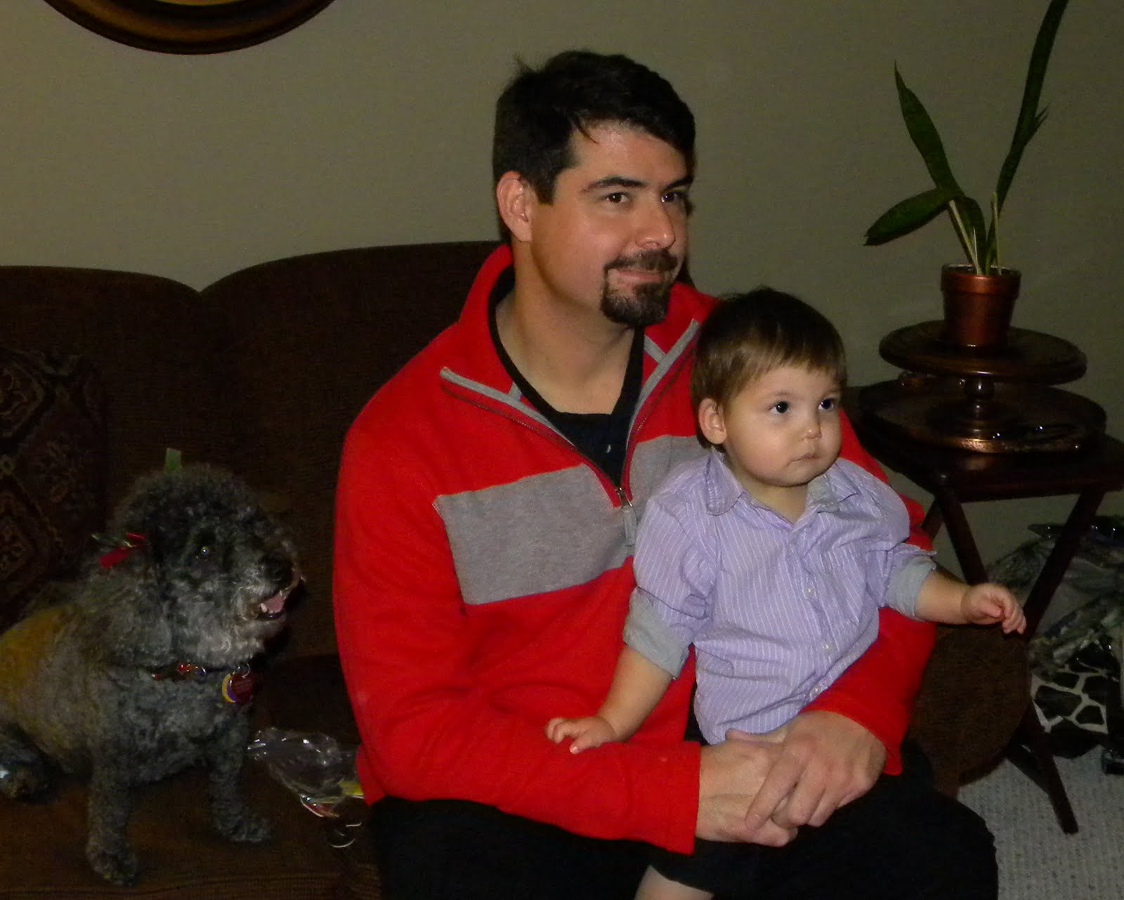 Dad and Damian enjoying the xmas day party. and Maggie too! Damian really appreciated how Maggie opened all his gifts for him-she is a pup of many talents!